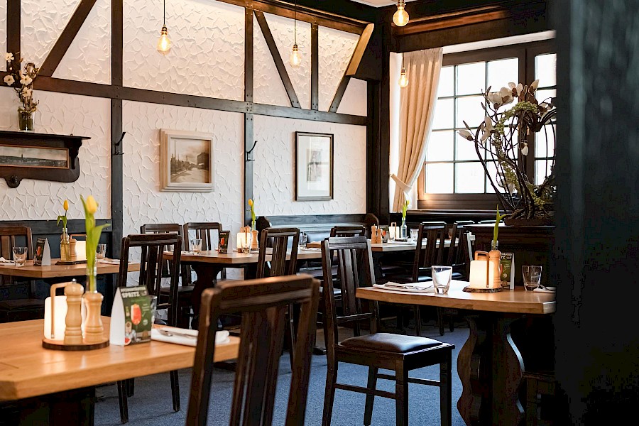 Im Wintergarten kann für 40 Gäste bequem eingedeckt werden. Die Schiebetüren der großen Fensterfront zum Biergarten lassen sich bei schönem Wetter zur Terrasse hin öffnen.
